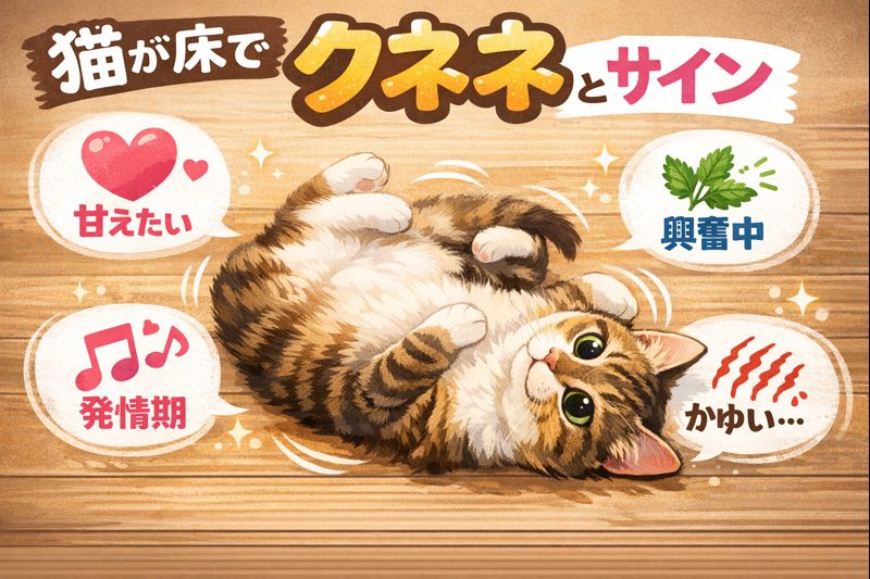 猫が床でクネクネする理由を“猫語翻訳”つきで解説していきます!